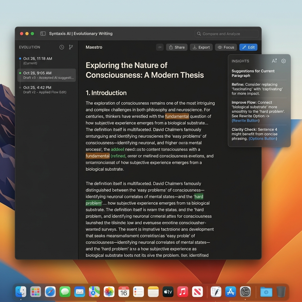 Premium macOS writing environment designed to elevate English prose through assistive AI rewriting and structural analysis.